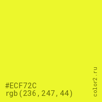 Цвет #ECF72C в цветовой модели RGB обозначается тремя октетами (236, 247, 44) в десятичном формате и #ECF72C в шестнадцатиричном (hex) формате, которые являются интенсивностью красного 236 (hex EC), интенсивность зелёного 247 (hex F7) и интенсивность синего 44 (hex 2C).