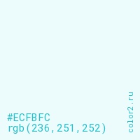 Цвет #ECFBFC в цветовой модели RGB обозначается тремя октетами (236, 251, 252) в десятичном формате и #ECFBFC в шестнадцатиричном (hex) формате, которые являются интенсивностью красного 236 (hex EC), интенсивность зелёного 251 (hex FB) и интенсивность синего 252 (hex FC).