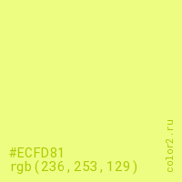 Цвет #ECFD81 в цветовой модели RGB обозначается тремя октетами (236, 253, 129) в десятичном формате и #ECFD81 в шестнадцатиричном (hex) формате, которые являются интенсивностью красного 236 (hex EC), интенсивность зелёного 253 (hex FD) и интенсивность синего 129 (hex 81).