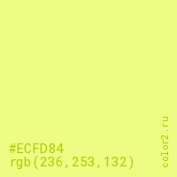 Цвет #ECFD84 в цветовой модели RGB обозначается тремя октетами (236, 253, 132) в десятичном формате и #ECFD84 в шестнадцатиричном (hex) формате, которые являются интенсивностью красного 236 (hex EC), интенсивность зелёного 253 (hex FD) и интенсивность синего 132 (hex 84).