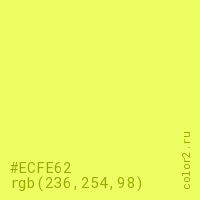 Цвет #ECFE62 в цветовой модели RGB обозначается тремя октетами (236, 254, 98) в десятичном формате и #ECFE62 в шестнадцатиричном (hex) формате, которые являются интенсивностью красного 236 (hex EC), интенсивность зелёного 254 (hex FE) и интенсивность синего 98 (hex 62).