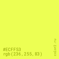 Цвет #ECFF53 в цветовой модели RGB обозначается тремя октетами (236, 255, 83) в десятичном формате и #ECFF53 в шестнадцатиричном (hex) формате, которые являются интенсивностью красного 236 (hex EC), интенсивность зелёного 255 (hex FF) и интенсивность синего 83 (hex 53).
