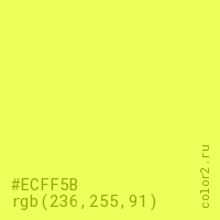 Цвет #ECFF5B в цветовой модели RGB обозначается тремя октетами (236, 255, 91) в десятичном формате и #ECFF5B в шестнадцатиричном (hex) формате, которые являются интенсивностью красного 236 (hex EC), интенсивность зелёного 255 (hex FF) и интенсивность синего 91 (hex 5B).