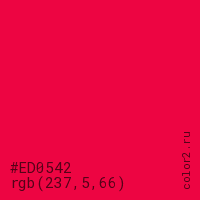 Цвет #ED0542 в цветовой модели RGB обозначается тремя октетами (237, 5, 66) в десятичном формате и #ED0542 в шестнадцатиричном (hex) формате, которые являются интенсивностью красного 237 (hex ED), интенсивность зелёного 5 (hex 05) и интенсивность синего 66 (hex 42).