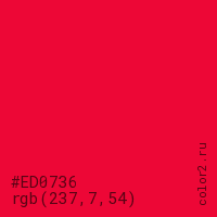 Цвет #ED0736 в цветовой модели RGB обозначается тремя октетами (237, 7, 54) в десятичном формате и #ED0736 в шестнадцатиричном (hex) формате, которые являются интенсивностью красного 237 (hex ED), интенсивность зелёного 7 (hex 07) и интенсивность синего 54 (hex 36).