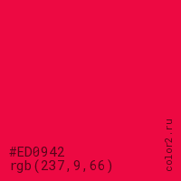 Цвет #ED0942 в цветовой модели RGB обозначается тремя октетами (237, 9, 66) в десятичном формате и #ED0942 в шестнадцатиричном (hex) формате, которые являются интенсивностью красного 237 (hex ED), интенсивность зелёного 9 (hex 09) и интенсивность синего 66 (hex 42).