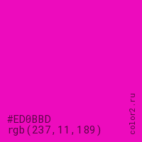 Цвет #ED0BBD в цветовой модели RGB обозначается тремя октетами (237, 11, 189) в десятичном формате и #ED0BBD в шестнадцатиричном (hex) формате, которые являются интенсивностью красного 237 (hex ED), интенсивность зелёного 11 (hex 0B) и интенсивность синего 189 (hex BD).