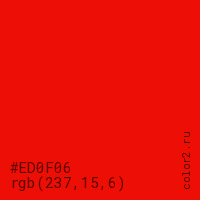Цвет #ED0F06 в цветовой модели RGB обозначается тремя октетами (237, 15, 6) в десятичном формате и #ED0F06 в шестнадцатиричном (hex) формате, которые являются интенсивностью красного 237 (hex ED), интенсивность зелёного 15 (hex 0F) и интенсивность синего 6 (hex 06).