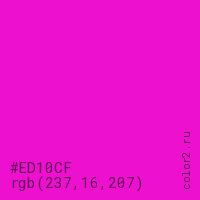 Цвет #ED10CF в цветовой модели RGB обозначается тремя октетами (237, 16, 207) в десятичном формате и #ED10CF в шестнадцатиричном (hex) формате, которые являются интенсивностью красного 237 (hex ED), интенсивность зелёного 16 (hex 10) и интенсивность синего 207 (hex CF).