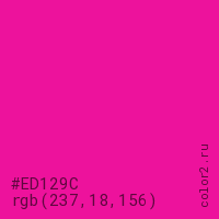 Цвет #ED129C в цветовой модели RGB обозначается тремя октетами (237, 18, 156) в десятичном формате и #ED129C в шестнадцатиричном (hex) формате, которые являются интенсивностью красного 237 (hex ED), интенсивность зелёного 18 (hex 12) и интенсивность синего 156 (hex 9C).