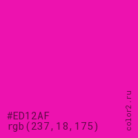 Цвет #ED12AF в цветовой модели RGB обозначается тремя октетами (237, 18, 175) в десятичном формате и #ED12AF в шестнадцатиричном (hex) формате, которые являются интенсивностью красного 237 (hex ED), интенсивность зелёного 18 (hex 12) и интенсивность синего 175 (hex AF).