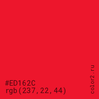 Цвет #ED162C в цветовой модели RGB обозначается тремя октетами (237, 22, 44) в десятичном формате и #ED162C в шестнадцатиричном (hex) формате, которые являются интенсивностью красного 237 (hex ED), интенсивность зелёного 22 (hex 16) и интенсивность синего 44 (hex 2C).
