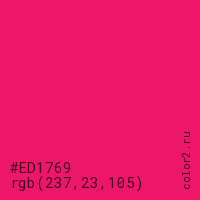 Цвет #ED1769 в цветовой модели RGB обозначается тремя октетами (237, 23, 105) в десятичном формате и #ED1769 в шестнадцатиричном (hex) формате, которые являются интенсивностью красного 237 (hex ED), интенсивность зелёного 23 (hex 17) и интенсивность синего 105 (hex 69).