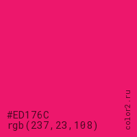 Цвет #ED176C в цветовой модели RGB обозначается тремя октетами (237, 23, 108) в десятичном формате и #ED176C в шестнадцатиричном (hex) формате, которые являются интенсивностью красного 237 (hex ED), интенсивность зелёного 23 (hex 17) и интенсивность синего 108 (hex 6C).