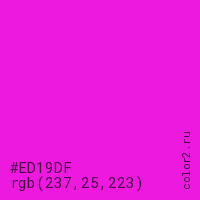 Цвет #ED19DF в цветовой модели RGB обозначается тремя октетами (237, 25, 223) в десятичном формате и #ED19DF в шестнадцатиричном (hex) формате, которые являются интенсивностью красного 237 (hex ED), интенсивность зелёного 25 (hex 19) и интенсивность синего 223 (hex DF).