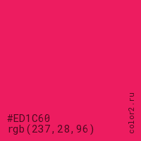 Цвет #ED1C60 в цветовой модели RGB обозначается тремя октетами (237, 28, 96) в десятичном формате и #ED1C60 в шестнадцатиричном (hex) формате, которые являются интенсивностью красного 237 (hex ED), интенсивность зелёного 28 (hex 1C) и интенсивность синего 96 (hex 60).