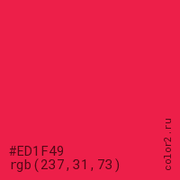 Цвет #ED1F49 в цветовой модели RGB обозначается тремя октетами (237, 31, 73) в десятичном формате и #ED1F49 в шестнадцатиричном (hex) формате, которые являются интенсивностью красного 237 (hex ED), интенсивность зелёного 31 (hex 1F) и интенсивность синего 73 (hex 49).