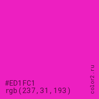 Цвет #ED1FC1 в цветовой модели RGB обозначается тремя октетами (237, 31, 193) в десятичном формате и #ED1FC1 в шестнадцатиричном (hex) формате, которые являются интенсивностью красного 237 (hex ED), интенсивность зелёного 31 (hex 1F) и интенсивность синего 193 (hex C1).