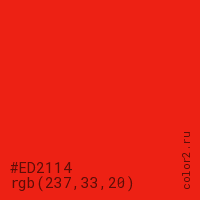 Цвет #ED2114 в цветовой модели RGB обозначается тремя октетами (237, 33, 20) в десятичном формате и #ED2114 в шестнадцатиричном (hex) формате, которые являются интенсивностью красного 237 (hex ED), интенсивность зелёного 33 (hex 21) и интенсивность синего 20 (hex 14).