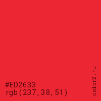 Цвет #ED2633 в цветовой модели RGB обозначается тремя октетами (237, 38, 51) в десятичном формате и #ED2633 в шестнадцатиричном (hex) формате, которые являются интенсивностью красного 237 (hex ED), интенсивность зелёного 38 (hex 26) и интенсивность синего 51 (hex 33).