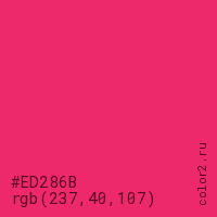 Цвет #ED286B в цветовой модели RGB обозначается тремя октетами (237, 40, 107) в десятичном формате и #ED286B в шестнадцатиричном (hex) формате, которые являются интенсивностью красного 237 (hex ED), интенсивность зелёного 40 (hex 28) и интенсивность синего 107 (hex 6B).