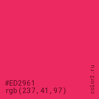 Цвет #ED2961 в цветовой модели RGB обозначается тремя октетами (237, 41, 97) в десятичном формате и #ED2961 в шестнадцатиричном (hex) формате, которые являются интенсивностью красного 237 (hex ED), интенсивность зелёного 41 (hex 29) и интенсивность синего 97 (hex 61).