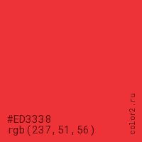 Цвет #ED3338 в цветовой модели RGB обозначается тремя октетами (237, 51, 56) в десятичном формате и #ED3338 в шестнадцатиричном (hex) формате, которые являются интенсивностью красного 237 (hex ED), интенсивность зелёного 51 (hex 33) и интенсивность синего 56 (hex 38).