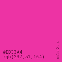 Цвет #ED33A4 в цветовой модели RGB обозначается тремя октетами (237, 51, 164) в десятичном формате и #ED33A4 в шестнадцатиричном (hex) формате, которые являются интенсивностью красного 237 (hex ED), интенсивность зелёного 51 (hex 33) и интенсивность синего 164 (hex A4).