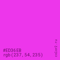 Цвет RGB(237, 54, 235) в процентом отношении количества цвета состоит из 92.9% красного (red), 21.2% зелёного (green) и 92.2% синего (blue).