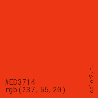 Цвет #ED3714 в цветовой модели RGB обозначается тремя октетами (237, 55, 20) в десятичном формате и #ED3714 в шестнадцатиричном (hex) формате, которые являются интенсивностью красного 237 (hex ED), интенсивность зелёного 55 (hex 37) и интенсивность синего 20 (hex 14).