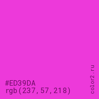 Цвет RGB(237, 57, 218) в процентом отношении количества цвета состоит из 92.9% красного (red), 22.4% зелёного (green) и 85.5% синего (blue).