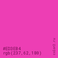Цвет #ED3EB4 в цветовой модели RGB обозначается тремя октетами (237, 62, 180) в десятичном формате и #ED3EB4 в шестнадцатиричном (hex) формате, которые являются интенсивностью красного 237 (hex ED), интенсивность зелёного 62 (hex 3E) и интенсивность синего 180 (hex B4).