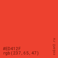 Цвет #ED412F в цветовой модели RGB обозначается тремя октетами (237, 65, 47) в десятичном формате и #ED412F в шестнадцатиричном (hex) формате, которые являются интенсивностью красного 237 (hex ED), интенсивность зелёного 65 (hex 41) и интенсивность синего 47 (hex 2F).