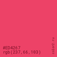 Цвет #ED4267 в цветовой модели RGB обозначается тремя октетами (237, 66, 103) в десятичном формате и #ED4267 в шестнадцатиричном (hex) формате, которые являются интенсивностью красного 237 (hex ED), интенсивность зелёного 66 (hex 42) и интенсивность синего 103 (hex 67).