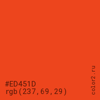 Цвет #ED451D в цветовой модели RGB обозначается тремя октетами (237, 69, 29) в десятичном формате и #ED451D в шестнадцатиричном (hex) формате, которые являются интенсивностью красного 237 (hex ED), интенсивность зелёного 69 (hex 45) и интенсивность синего 29 (hex 1D).