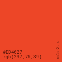 Цвет #ED4627 в цветовой модели RGB обозначается тремя октетами (237, 70, 39) в десятичном формате и #ED4627 в шестнадцатиричном (hex) формате, которые являются интенсивностью красного 237 (hex ED), интенсивность зелёного 70 (hex 46) и интенсивность синего 39 (hex 27).