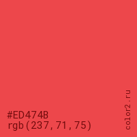 Цвет #ED474B в цветовой модели RGB обозначается тремя октетами (237, 71, 75) в десятичном формате и #ED474B в шестнадцатиричном (hex) формате, которые являются интенсивностью красного 237 (hex ED), интенсивность зелёного 71 (hex 47) и интенсивность синего 75 (hex 4B).