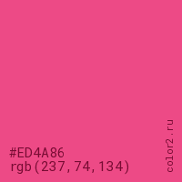 Цвет #ED4A86 в цветовой модели RGB обозначается тремя октетами (237, 74, 134) в десятичном формате и #ED4A86 в шестнадцатиричном (hex) формате, которые являются интенсивностью красного 237 (hex ED), интенсивность зелёного 74 (hex 4A) и интенсивность синего 134 (hex 86).