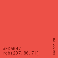 Цвет #ED5047 в цветовой модели RGB обозначается тремя октетами (237, 80, 71) в десятичном формате и #ED5047 в шестнадцатиричном (hex) формате, которые являются интенсивностью красного 237 (hex ED), интенсивность зелёного 80 (hex 50) и интенсивность синего 71 (hex 47).