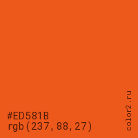 Цвет #ED581B в цветовой модели RGB обозначается тремя октетами (237, 88, 27) в десятичном формате и #ED581B в шестнадцатиричном (hex) формате, которые являются интенсивностью красного 237 (hex ED), интенсивность зелёного 88 (hex 58) и интенсивность синего 27 (hex 1B).