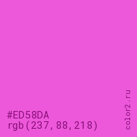 Цвет #ED58DA в цветовой модели RGB обозначается тремя октетами (237, 88, 218) в десятичном формате и #ED58DA в шестнадцатиричном (hex) формате, которые являются интенсивностью красного 237 (hex ED), интенсивность зелёного 88 (hex 58) и интенсивность синего 218 (hex DA).