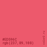 Цвет #ED596C в цветовой модели RGB обозначается тремя октетами (237, 89, 108) в десятичном формате и #ED596C в шестнадцатиричном (hex) формате, которые являются интенсивностью красного 237 (hex ED), интенсивность зелёного 89 (hex 59) и интенсивность синего 108 (hex 6C).