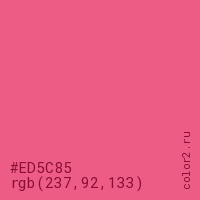 Цвет #ED5C85 в цветовой модели RGB обозначается тремя октетами (237, 92, 133) в десятичном формате и #ED5C85 в шестнадцатиричном (hex) формате, которые являются интенсивностью красного 237 (hex ED), интенсивность зелёного 92 (hex 5C) и интенсивность синего 133 (hex 85).