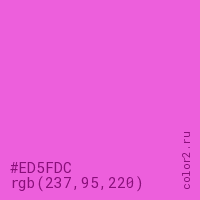 Цвет #ED5FDC в цветовой модели RGB обозначается тремя октетами (237, 95, 220) в десятичном формате и #ED5FDC в шестнадцатиричном (hex) формате, которые являются интенсивностью красного 237 (hex ED), интенсивность зелёного 95 (hex 5F) и интенсивность синего 220 (hex DC).