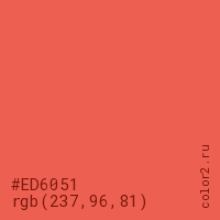 Цвет #ED6051 в цветовой модели RGB обозначается тремя октетами (237, 96, 81) в десятичном формате и #ED6051 в шестнадцатиричном (hex) формате, которые являются интенсивностью красного 237 (hex ED), интенсивность зелёного 96 (hex 60) и интенсивность синего 81 (hex 51).