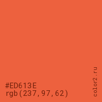 Цвет #ED613E в цветовой модели RGB обозначается тремя октетами (237, 97, 62) в десятичном формате и #ED613E в шестнадцатиричном (hex) формате, которые являются интенсивностью красного 237 (hex ED), интенсивность зелёного 97 (hex 61) и интенсивность синего 62 (hex 3E).