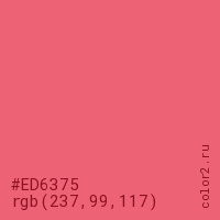 Цвет #ED6375 в цветовой модели RGB обозначается тремя октетами (237, 99, 117) в десятичном формате и #ED6375 в шестнадцатиричном (hex) формате, которые являются интенсивностью красного 237 (hex ED), интенсивность зелёного 99 (hex 63) и интенсивность синего 117 (hex 75).