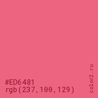 Цвет #ED6481 в цветовой модели RGB обозначается тремя октетами (237, 100, 129) в десятичном формате и #ED6481 в шестнадцатиричном (hex) формате, которые являются интенсивностью красного 237 (hex ED), интенсивность зелёного 100 (hex 64) и интенсивность синего 129 (hex 81).