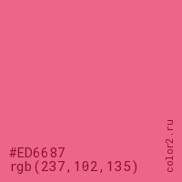 Цвет #ED6687 в цветовой модели RGB обозначается тремя октетами (237, 102, 135) в десятичном формате и #ED6687 в шестнадцатиричном (hex) формате, которые являются интенсивностью красного 237 (hex ED), интенсивность зелёного 102 (hex 66) и интенсивность синего 135 (hex 87).