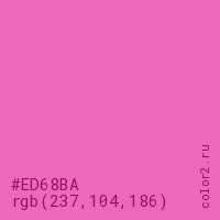 Цвет #ED68BA в цветовой модели RGB обозначается тремя октетами (237, 104, 186) в десятичном формате и #ED68BA в шестнадцатиричном (hex) формате, которые являются интенсивностью красного 237 (hex ED), интенсивность зелёного 104 (hex 68) и интенсивность синего 186 (hex BA).
